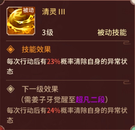 清灵:每次行动后有一定的概率能够清除姜子牙自身的异常状态,